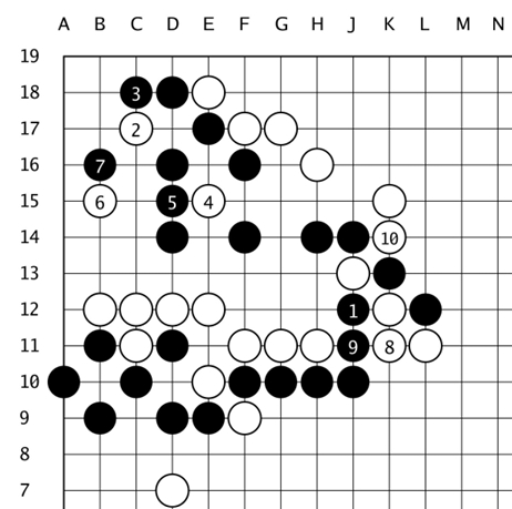 后来,黑棋在左下角压了一步,白爬了一手,记录完。全局棋谱如下: