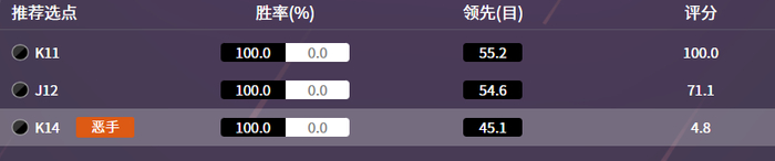 双方围绕上边空,展开了一系列争夺,AI全部判定为恶手!它始终推荐在A位(K11)断。